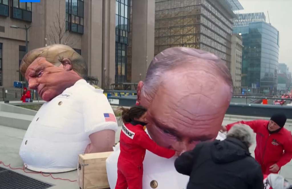 Brüsszelben a Greenpeace tiltakozott az EU fosszilis energiaimport-függése ellen, és a megújuló energiákba való beruházást sürgette az USA-tól és Oroszországtól való függés helyett. (Képernyőfelvétel / Euronews)