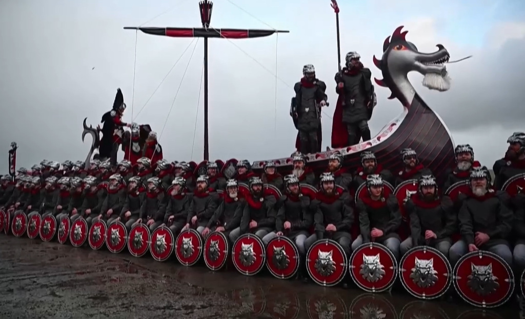 Skót vikingek vonulnak az utcákon az Up Helly Aa ünnepség, a skót télbúcsúztató tűzfesztivál alkalmából. A fesztivált a Shetland-szigeteken (főként Lerwickben) rendezik meg minden év január–februárjában. (Képernyőfelvétel / Euronews)