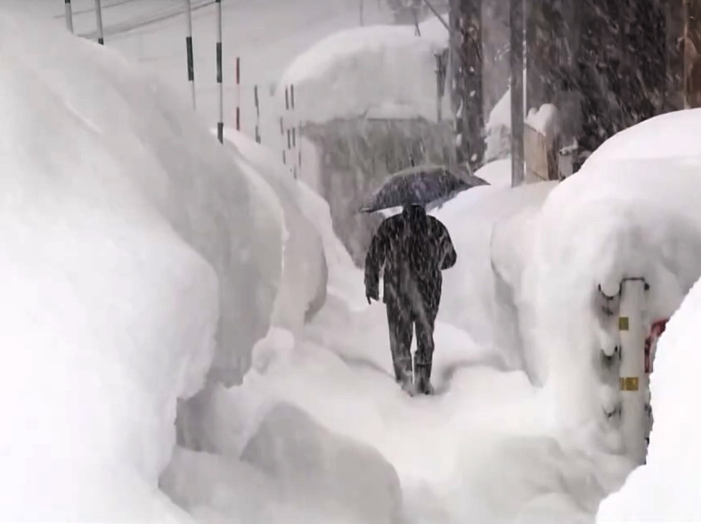 A japán meteorológiai szolgálat arra figyelmeztet, hogy a Japán-tenger partvidékén erős havazás várható, egyes térségekben akár 70 centiméter hó hullhat. A hóréteg vastagsága jelenleg Niigata egyes térségeiben 264 centiméter, Aomori városában pedig 150 centiméter. (Képernyőfelvétel / Euronews)