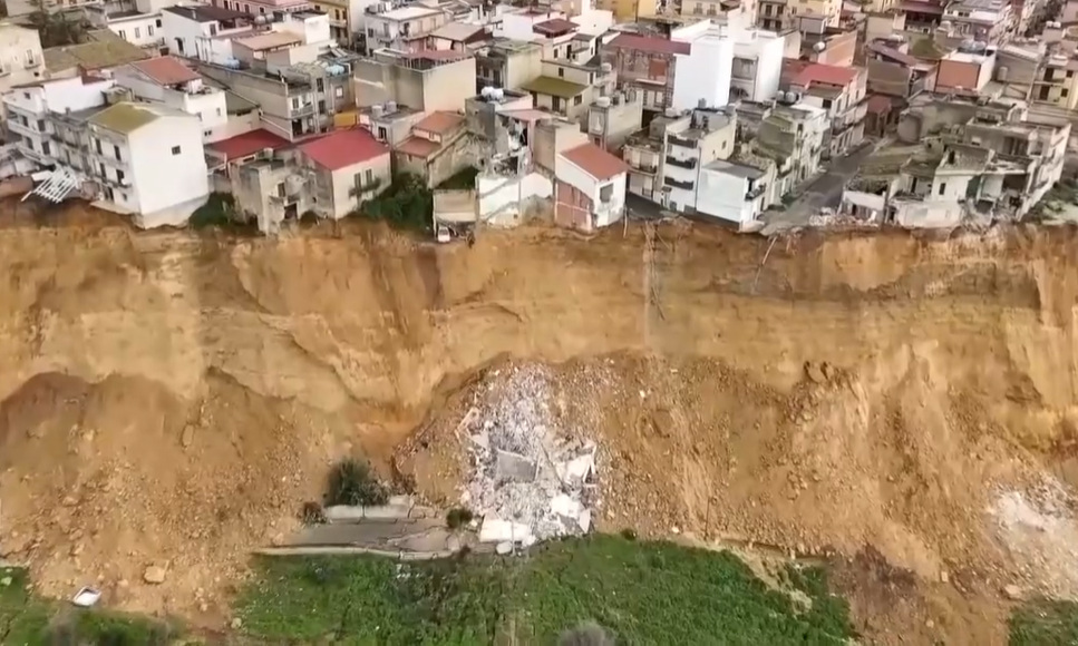 A földcsuszamlás következményei a szicíliai Niscemiben. A mintegy 25 ezer lakosú, laza homokkőre és agyagra épült település közel 30 éve már elszenvedett egy hasonló földcsuszamlást. Most 1500 embert kellett kitelepíteni. Szakértők arra figyelmeztetnek, hogy az ilyen katasztrófák gyakoribbá válhatnak, mivel a klímaváltozás egyre szélsőségesebb időjárást hoz. (Képernyőfelvétel / Euronews)
