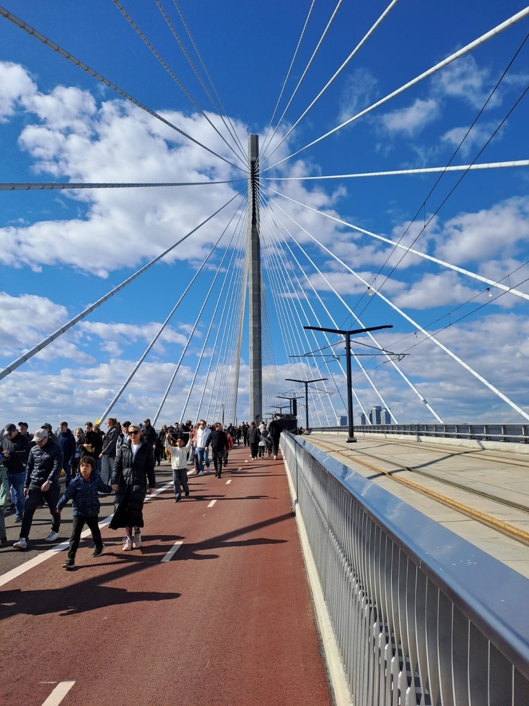 A helsinki Kruunuvuorensilta Finnország leghosszabb és legmagasabb hídja, amely a belvárost köti össze Laajasalo szigetével. Az 1,2 kilométer hosszú, 135 méter magas pilonnal rendelkező hidat kizárólag a fenntartható közlekedésnek, azaz villamosoknak, kerékpárosoknak és gyalogosoknak tartják fenn. A kép a tegnapi megnyitón készült. (Facebook / Wim Veerbeek)