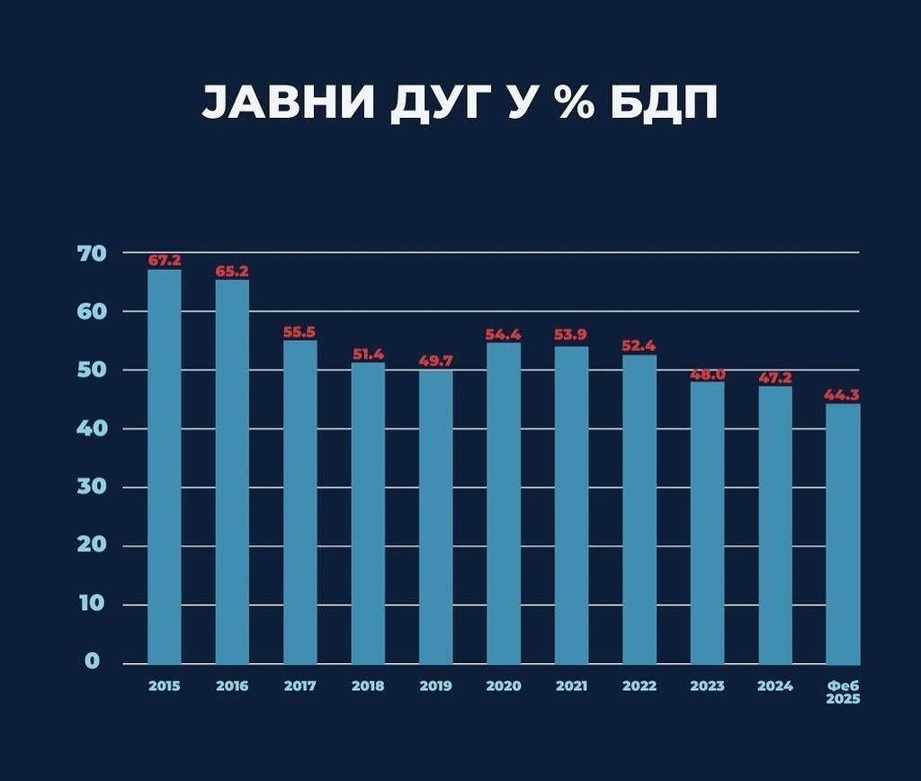 Siniša Mali ügyvezető pénzügyminiszter közölte, hogy a közadósság aránya a bruttó hazai termékhez (GDP) viszonyítva jelenleg 44,3 százalék Szerbiában, ami jelentősen elmarad az Európai Unió átlagától, amely a legfrissebb adatok szerint 81,6 százalék.