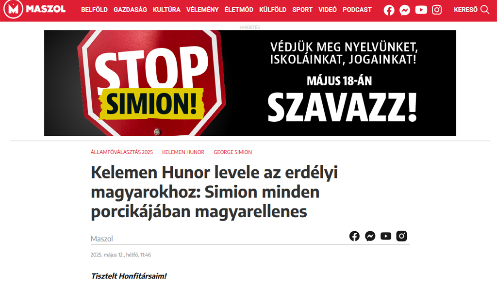 Kelemen Hunor az erdélyi magyarokhoz intézett, a Maszol.ro hírportál által hétfőn közzétett levélben arra kérte a közösség tagjait, hogy menjenek el szavazni a román elnökválasztás második fordulójában és Nicusor Dan bukaresti főpolgármesterre adják voksukat, megakadályozandó a szerinte "minden porcikájában magyarellenes" George Simion, a Románok Egyesüléséért Szövetség (AUR) elnöke államfővé választását.