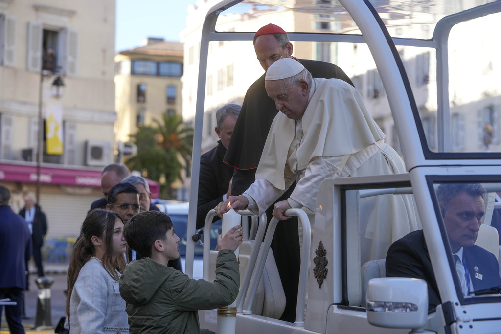 A 88. évét kedden betöltő, kerekesszékben érkező „Papa Francescut”, ahogyan korzikai (korz) nyelven nevezik, Bruno Retailleau, a leköszönő Barnier-kormány belügyminisztere és népviseletbe öltözött gyermekek üdvözölték a korzikai főváros, Ajaccio repülőterén. A pápa a kilencórás látogatás után, még az esti órákban visszatér a Vatikánba.