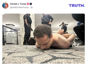Szintén közösségi oldalán a földön fekvő, megbilincselt férfiról is nyilvánosságra hozott két fényképet, amelyen a támadó felsőruha nélkül látható.