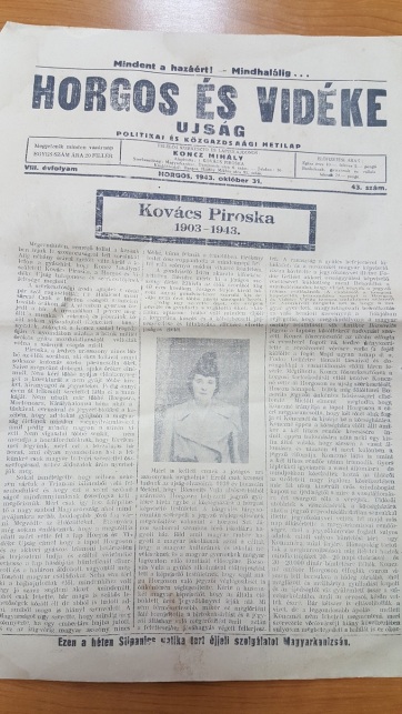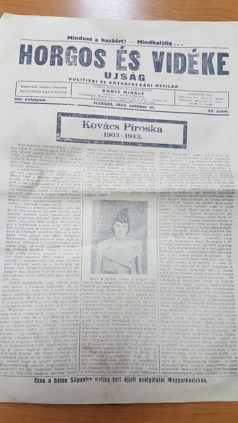 “Délvidéki magyar újságírónő halála. A Horgos és Vidéke című politikai és közgazdasági hetilap alapítója, Koncz Mihályné szül. Kovács Piroska 40 éves korában meghalt. Az újságírónő tulajdonképpen hősiességének áldozata. 1939-ben Bozsovics Vula Alsó Szerbiából származó jegyző Horgos képviselő testületével fehér ívet íratott alá azzal, hogy jegyzői véglegesítését kéri vele. Az aláírt ívre aztán adásvételi szerződést hamisított a község magyar iskolájáról és annak földjéről. Az újság az ügyet nyilvánosságra hozta. A jegyző erre elfogatta Koncz Mihályt. Fogsága alatt felesége, Kovács Piroska irányította a lapot. Mikor a jegyző ezt megtudta, az asszonyt is elfogatta. Az asszony elfogatása előtt menekülni akart, s menekülés közben átizzadt. Mikor elfogták, nyirkos börtönbe vetették. Ott megfázott és mellhártyagyulladást kapott és most meghalt.” (Székely Szó, 1943. november 5.)