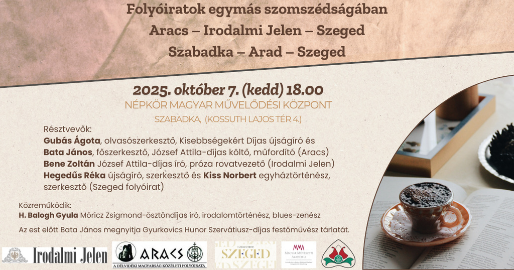 Gyurkovics Hunor Szervátiusz-díjas festőművész (aki az Aracs folyóirat egyik alapítója és képzőművészeti szerkesztője) legújabb munkáit állítja ki, amelyekről Bata János, az Aracs főszerkesztője mond bevezető gondolatokat. Az Irodalmi Jelent Bene Zoltán rovatvezető, a Szeged című folyóiratot pedig Hegedűs Réka és Kiss Norbert szerkesztők mutatják be. Az Aracs folyóirat képviseletében a főszerkesztő mellett Gubás Ágota olvasószerkesztő vesz részt.