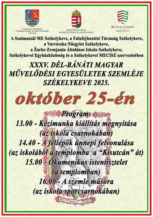 Оktóber 25-én, szombaton rendezik meg Székelykevén a XXXV. dél-bánáti magyar művelődési egyesületek szemléjét. A 13 órakor kezdődő program változatos és színes időtöltést kínál az érdeklődőknek.
