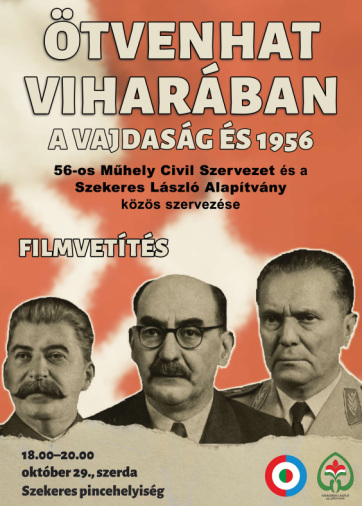 Az 56-os Műhely Civil Szervezet és a Szekeres László Alapítvány közös szervezésében kerül sor az Ötvenhat viharában – a Vajdaság és 1956 című magyar dokumentumfilm vetítésére és az azt követő közönségtalálkozóra. Az október 29-én, szerdán 18 órakor kezdődő filmvetítésen Lavro Ferenc újvidéki származású rendező legújabb alkotása kerül bemutatásra, melynek középpontjában az 1956-os forradalom vajdasági magyarok identitására gyakorolt hatása áll. A film a Jugoszláviába menekült magyarok sorsán keresztül mutatja be azt a bonyolult világpolitikai helyzetet, amely miatt a szabadságharcunk megbukott.