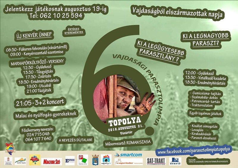 Az idén először a rendezvényt összekötik a Topolyáról, illetve Vajdaságból elszármazottak napjával is. A Parasztolimpia helyszínén, a vásártéren elhelyeznek egy nagy térképet, melyen bárki bejelölheti, hogy honnan érkezett. Már a korábbi években is volt Kanadában élő, de innen elszármazott nevezője is a versenynek, a nézők pedig valóban a világ minden tájáról érkeztek. A kísérőprogramok közül ezúttal sem marad el a kisállat simogatás, a lovaglás, de lesz kirakodóvásár és paraszt jakuzzi is. A versenyzők nevezése díjtalan, a 062 10 25 594-es számon lehet nevezni. A rendezvényt a helyi közösség és a helyi önkormányzat mellett helybeli meg környékbeli vállalkozók is támogatják.