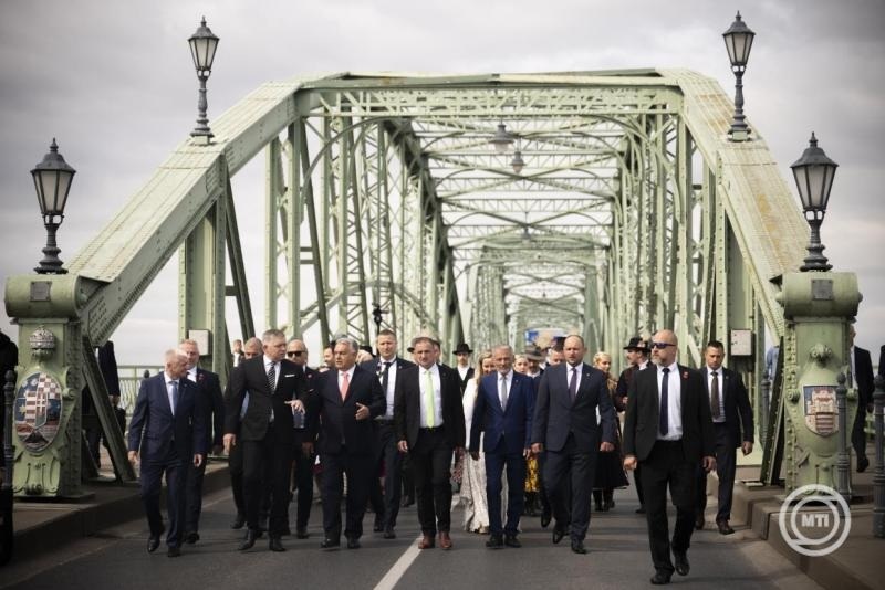 Felidézte azt is, hogy harmadik alkalommal mondhat beszédet a Mária Valéria hídnál, de első alkalommal állhat ott Robert Ficóval, aki Szlovákia történelmének leghosszabb hivatali idejével rendelkező, "elnyűhetetlen és elpusztíthatatlan" miniszterelnöke - fogalmazott Orbán Viktor.
