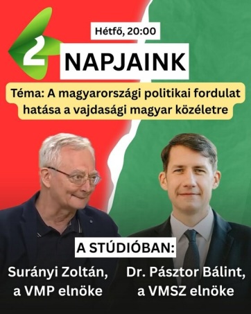 Pásztor Bálint, a Vajdasági Magyar Szövetség elnöke és Surányi Zoltán, a Vajdasági Magyar Plénum elnöke lesz estére a Napjaink című műsor stúdióvendége. Hosszú idő után újra valódi politikai vita kerül a képernyőre.