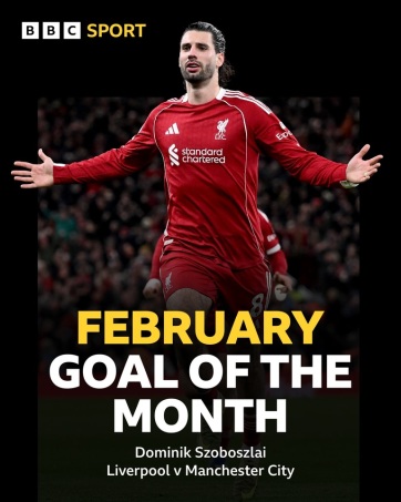 Szoboszlai Dominiknak a Manchester City ellen lőtt gólját választották a legszebb februári találatnak a BBC Match of the Day című műsorának nézői.