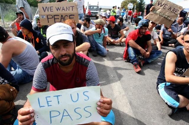 A menekülteknek ez a csoportja feliratokat tart a magasba “Nyissátok meg a kapukat az emberek és a gyerekek előtt. Kérjük, segítsetek. Engedjenek áthaladni, mi menekültek vagyunk. Hol vannak az emberi jogok? Békében akarunk élni.”