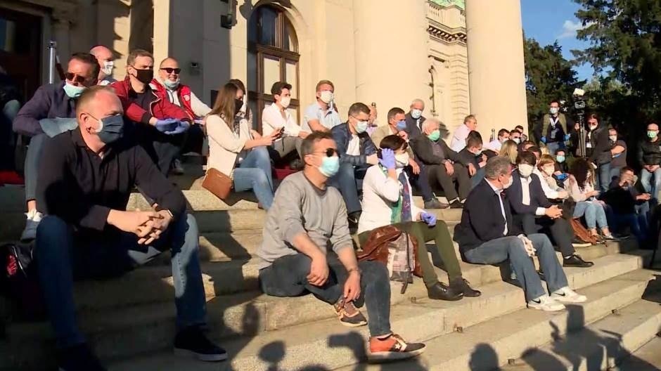 A szerbiai ellenzék képviselői, akik a rendkívüli állapot bevezetése előtt a választások bojkottjára szólítottak fel és kedden ugyancsak bojkottálták a parlament ülését is, ma 18 órakor megkezdték a korábban bejelentett tiltakozásukat a szerb szkupstina épülete előtt. Annak ellenére, hogy 18 órakor életbe lépett a kijárási tilalom, a Szövetség Szerbiáért (SzS), a Szabad Polgárok Mozgalma (PSG), a Szociáldemokrata Párt tagjai és szimpatizánsai elfoglalták a parlament lépcsőit a rendkívüli állapot megítélésük szerint alkotmányellenes bevezetése és Szerbia polgárainak bezárása miatt.