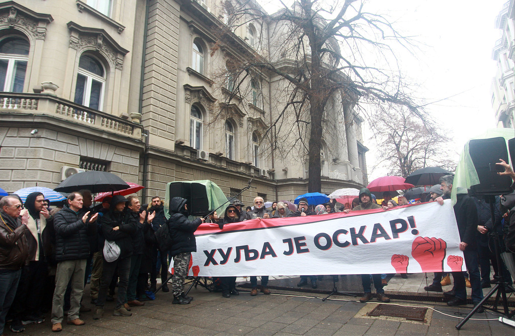 A tiltakozásra az ügyvédek transzparensekkel érkeztek, melyekre ezt írták: „Oszkár a gazember”, „Mi nem vagyunk csőcselék, de te gazember vagy”. Ezzel válaszoltak Aleksandar Vučić államfő sértésére, aki a Szerbiai Ügyvédi Kamara tagjait „csőcseléknek” nevezte, miután a kamara bejelentette a munkavégzés hétnapos felfüggesztését.