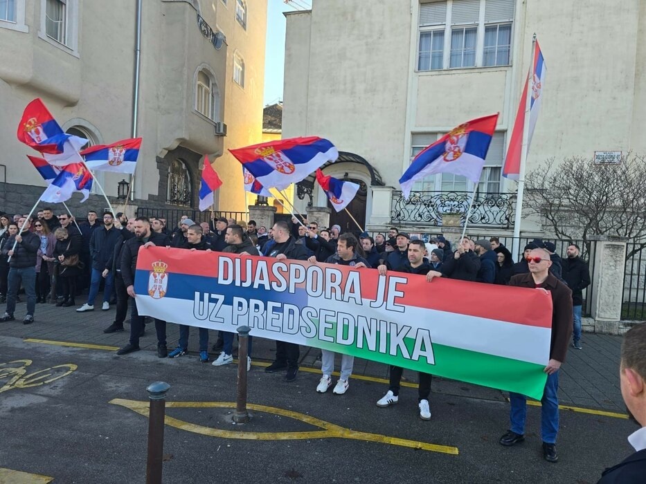 A nagy számban összegyűlt résztvevők szerb zászlókat lengettek, valamint olyan transzparenseket tartottak, amelyeken a „Éljen Szerbia” és a „A diaszpóra az elnök mellett áll” feliratok voltak olvashatók - jelentette a Tanjug.