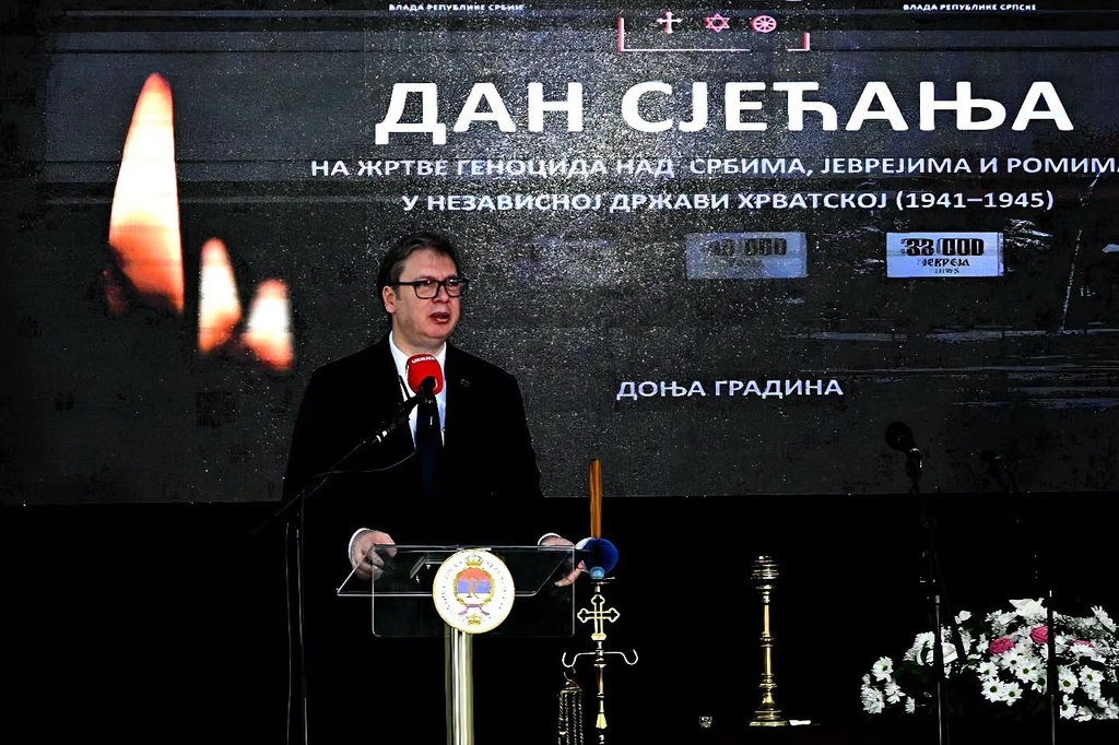 „Tavaly megfogadtuk, hogy emlékközpontot építünk itt. Az elmúlt egy évben megpróbálták meggyengíteni Szerbiát, külföldről érkező jelentős pénzügyi támogatással próbálták aláásni hazánkat. Ennek egyik oka az volt, hogy ne beszéljünk nyíltan a múltunkról, és ne ápoljuk az emlékezés kultúráját. Megígérem, hogy egyetlen nap sem telik el anélkül, hogy ne foglalkoznék ezzel: hetente egyeztetéseket tartok majd, amíg itt – elsősorban szerbiai forrásokból, a boszniai Szerb Köztársaság esetleges hozzájárulásával – fel nem épül egy impozáns emlékközpont. Olyan hely lesz, ahová senkinek sem lesz megtiltva a belépés, ellentétben azzal, hogy ma nem mehetünk el Jasenovacba, koszorút helyezzünk el. Nyitva áll majd mindenki előtt, hogy mindenki megismerhesse, milyen szörnyű bűncselekmények történtek ezen a helyen” – mondta Vučić.