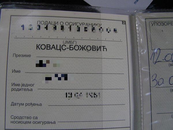 Ugyanígy egy újvidéki nő betegkönyvében a Kovács vezetéknevet a magyar helyesírás szerint írták, ám cirill betűkkel (a képen).