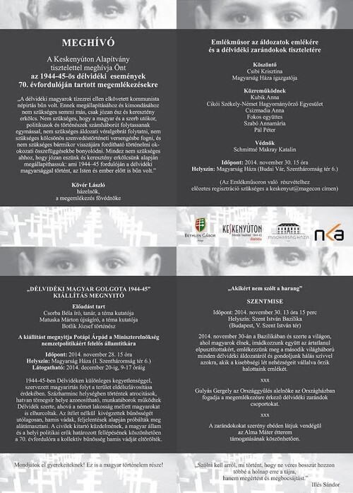 A Keskenyúton Alapítvány megemlékezéseket szervez az 1994–45-ös délvidéki események 70. évfordulója alkalmából Budapesten, a Magyarság Házában és a Szent István Bazilikában.