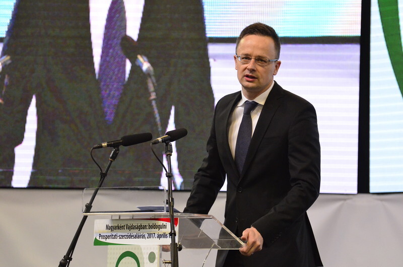 Szijjártó Péter Magyarország külügyminisztere a Sportcsarnokban a nyertesek tömeges jelenlétével kapcsolatban kiemelte: a nemzeti összetartozás mint közös ügy a legjobb leírása a mai napnak. Többször is hangsúlyozta, hogy a két ország kormánya a történelmi sérelmeket rendezte, jelenleg pedig a szerb-magyar barátság történelmi csúcsán van. Kiemelte, a két ország úgy tekint a vajdasági magyarokra, mint a Magyarországot és Szerbiát összekötő legfontosabb kapocsra, amelynek megerősödése mindkét országot erősíti. „Nem volt ez mindig így. Pár éve, ha egy szerb elnökjelöltnek eszébe jutott volna meghívni a magyar külügyminisztert, hogy az beszédet mondjon a kampányrendezvényén, azt gondolták volna, elment a józan esze. Ma ez másként van, mi barátként tekintünk egymásra. Ehhez a határ mindkét oldalán a politikai vezetőknek komoly erőfeszítéseket kellett tenni és kompromisszumokat kötni, bátor vezetőkre és az önök bátorítására volt szükség” – mondta a magyar diplomácia vezetője. Vučić fölényes győzelmében ennek a politikának a visszaigazolását látjuk, aki személyesen is sok erőfeszítést tett azért, hogy a feszültségek helyett ma barátságról beszélhessünk, tette hozzá Szijjártó, aki a VMSZ-nek is gratulált, amiért az úgy döntött, Aleksandar Vučićot támogatja az elnökválasztáson. A két ország közötti jó viszony gazdasági paramétereit taglalva a külügyminiszter elmondta, ma Szerbia Magyarország legfontosabb kereskedelmi partnere ebben a térségben, kétmilliárd eurós árucserével, ami 71 százalékos növekedés a 2010-es évhez képest. Elmondta, a magyar kormány ezt a viszont két fejezet mentén kívánja folytatni, egyik Szerbia uniós integrációjának támogatása, a másik pedig a vajdasági magyarság további erősítése. Az elsővel kapcsolatban kiemelte, Budapest mindig is teljes mellszélességgel támogatni fogja Szerbia gyorsított ütemű uniós integrációját és igyekszik erről az útról minden akadályt félregördíteni. A magyarságot célzó gazdaságfejlesztési programmal kapcsolatban kiemelte, a tavalyi első két körben 2968 pályázat érkezett, amiből 2408-at támogattak, a harmadik körben pedig 3979 pályázatot adtak be, amelyből majdnem 3800-at pozitívan bíráltak el.