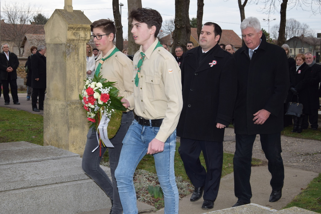Az ünnepre Magyarkanizsára érkezett Nagykanizsa küldöttségében volt Micsinai Dominik, Radnóti-díjas szavaló is, aki Kozma Andor A karthágói harangok című költeményét szavalta el, majd a megjelentek megkoszorúzták az 1848/49-es forradalom és szabadságharc magyarkanizsai hőseinek emléktábláját. Elsőként Fejsztámer Róbert magyarkanizsai polgármester és Miloš Kravić, a községi képviselő testület elnöke helyezték el az önkormányzat koszorúját, majd az emlékezés virágait az emléktáblához helyezte dr. Menyhárt Attila, a Szabadkai Magyar Főkonzulátus vezető konzulja, a két testvérváros, Nagykanizsa és Ferencváros küldöttségei, Hajnal Jenő és Nyilas Leonov Anita, a Magyar Nemzeti Tanács elnöke illetve alelnöke, Magyarkanizsa helyi közösség, a Gyöngyszemeink Iskoláskor Előtti Intézmény valamint a Jovan Jovanović Zmaj Általános Iskola vezetői, a Vajdasági Magyar Szövetség tisztségviselői és a nyugdíjasok községi szervezetének képviselői is. A temetői megemlékezés a Szózat megzenésített változatának akkordjaival zárult.