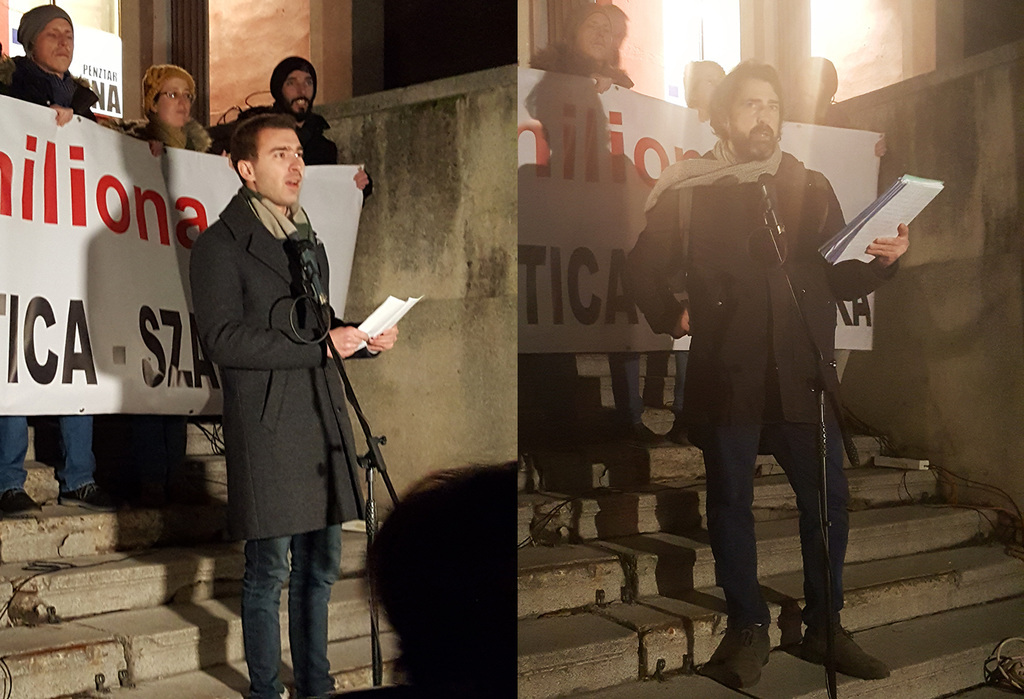 Elsőként Gyulai Zsolt, a tüntetésszervező tanács tagja, a bezárt Klein house tulajdonosa szólt az egybegyűltekhez előbb szerb nyelven. Elmondta, az motiválta, hogy megszervezze a tüntetést, ahogyan a mindennapok során él.
