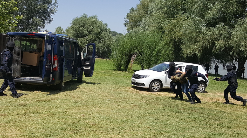 A jármű kulcsának átadása után következett az alkalmi ünnepség látványosabb része, ugyanis a belügy tagjai bemutatót tartottak. Elsőként néhány kört tettek meg a Tiszán az új járművükkel, majd egy kábítószer-kereskedőt fogtak el drogkereső kutya segítségével. A nagyszámú nézőközönség szemtanúja lehetett egy fiktív emberrablásnak is. A strandon egy diáklány kerül gyermekrabló fogságába, de a rendőrségi rohamosztag gyorsan kiszabadítja a kislányt.