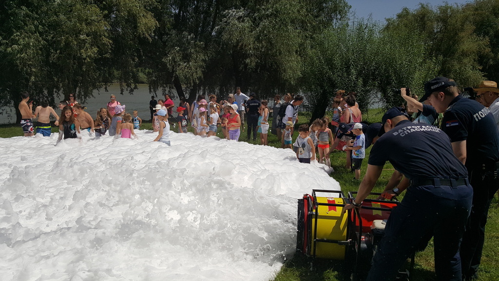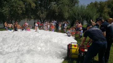 Az akció végén a tűzoltók tartottak bemutatót, ezúttal úgy, hogy habfürdőt biztosítottak a gyerekeknek, akik vidáman pocskolva hűsölhettek így a kánikulában.