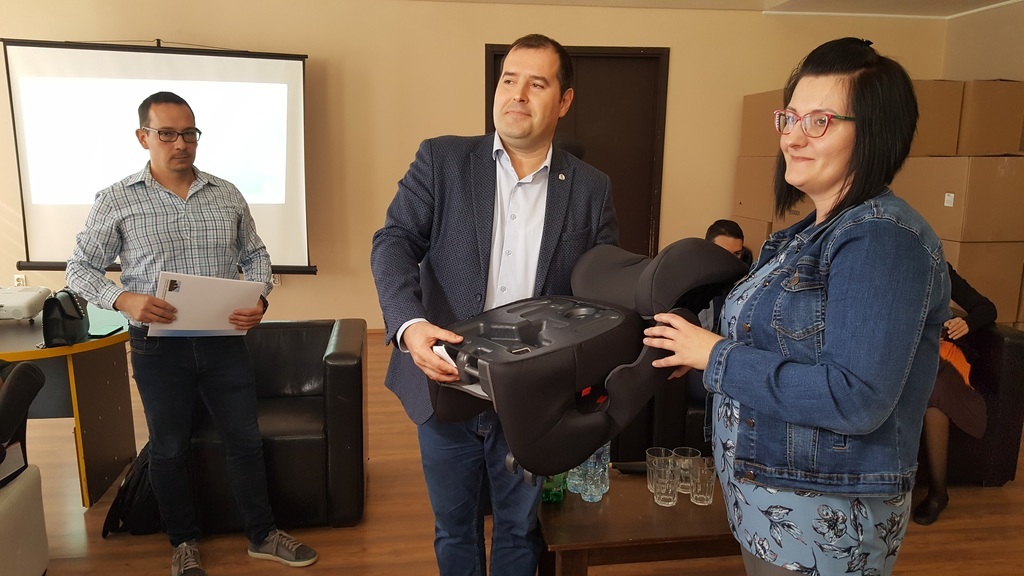 - Ez egy nagyon népszerű pályázat a szülők körében, mert gyermekeik biztonságáról van szó a közlekedésben. Idén 76 jelentkezőnk volt, s mindnyájan hibátlan pályázatot adtak át, megvolt az összes dokumentáció, amit bekértünk. Itt vannak a Közlekedésbiztonsági Ügynökség szakemberei, akik most is megtartják azt az ismeretterjesztő előadást, amit minden évben megtartanak, hogy hogyan kell helyesen beszerelni ezt az ülést, s hogyan kell biztonságosan használni. Az ülés az kétrészes, a 9-től 36 kilós gyermekek számára van kifejlesztve. Tehát amikor a gyermek eléri a 120 centiméteres magasságot, akkor a háttámlát ki lehet belőle venni, s magasítóként lehet használni a maradék részét.