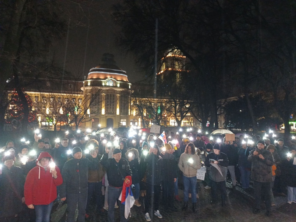 Kedden este az ónos eső ellenére, a Tisza menti város szívében lévő parkban, a zenepavilon előtt mintegy százan gyűltek össze hogy támogatásukról biztosítsák a Belgrádban, Újvidéken, illetve más szerbiai városban tiltakozó egyetemi hallgatókat.