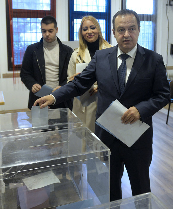 Ivica Dačić házelnök, a Szerbiai Szocialista Párt vezetője az elsők között adta le voksát a dedinjei helyi közösségben lévő szavazóhelyen, ahová feleségével és fiával érkezett.