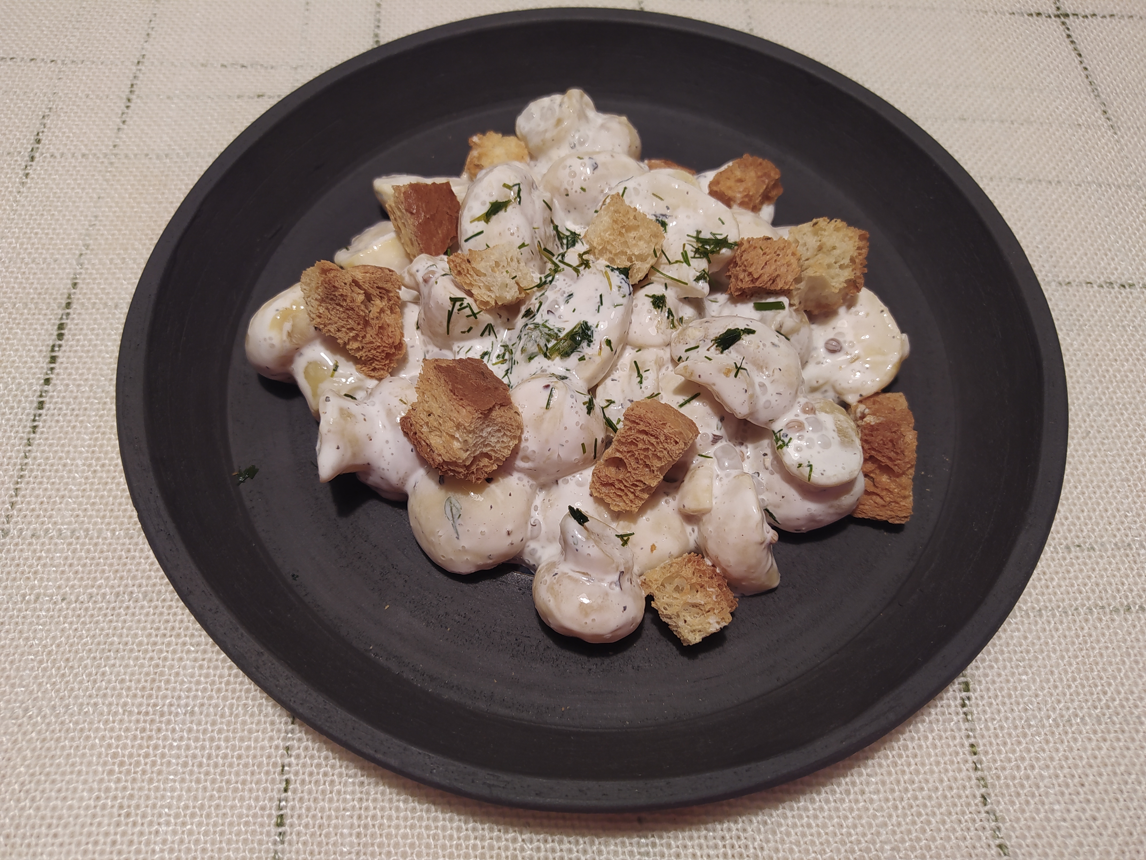 Egy tálkában összekeverjük a fűszereket és a tejszínt (ha savanykásan szeretjük, adunk hozzá egy kávéskanálnyi balzsamecetet) ráöntjük a megmosott, lecsepegtetett gombára, óvatosan összekeverjük, rászórjuk a krutont (pirított kenyérkockát), és a kaporral díszítve azonnal fogyasztjuk.