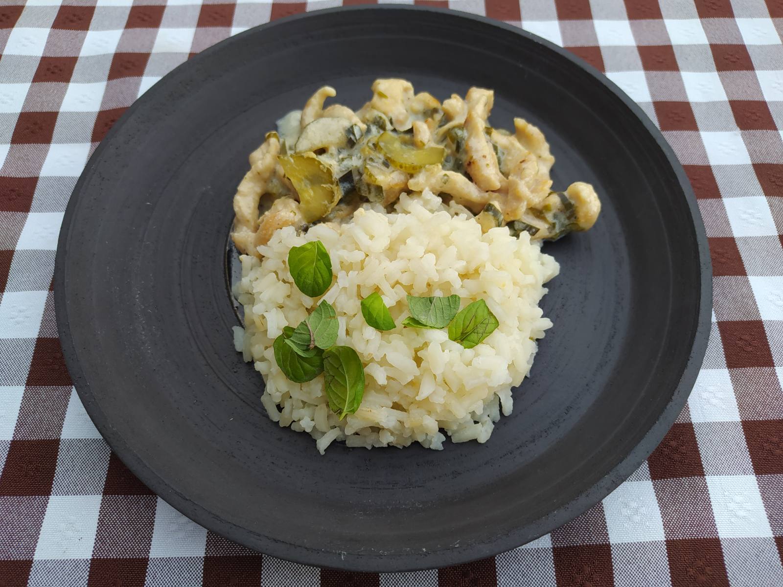 A vékonyra felcsíkozott húst megforgatjuk a keményítőben, a forró olajban megpirítjuk, mellétesszük a felaprított póréhagymát és a metélőfokhagymát, és még 3 percig pirítjuk. Belehintjük a fűszereket, felöntjük a tejszínnel és takaréklángon addig főzzük, amíg a hús nem puhul meg. Ha szükséges, önthetünk hozzá kevés vizet. Ekkor belekeverjük a mustárt, és a tetszés szerint felkockázott vagy felkarikázott savanyú uborkát, és 2 perc alatt összefőzzük. Azonnal melegen tálaljuk.