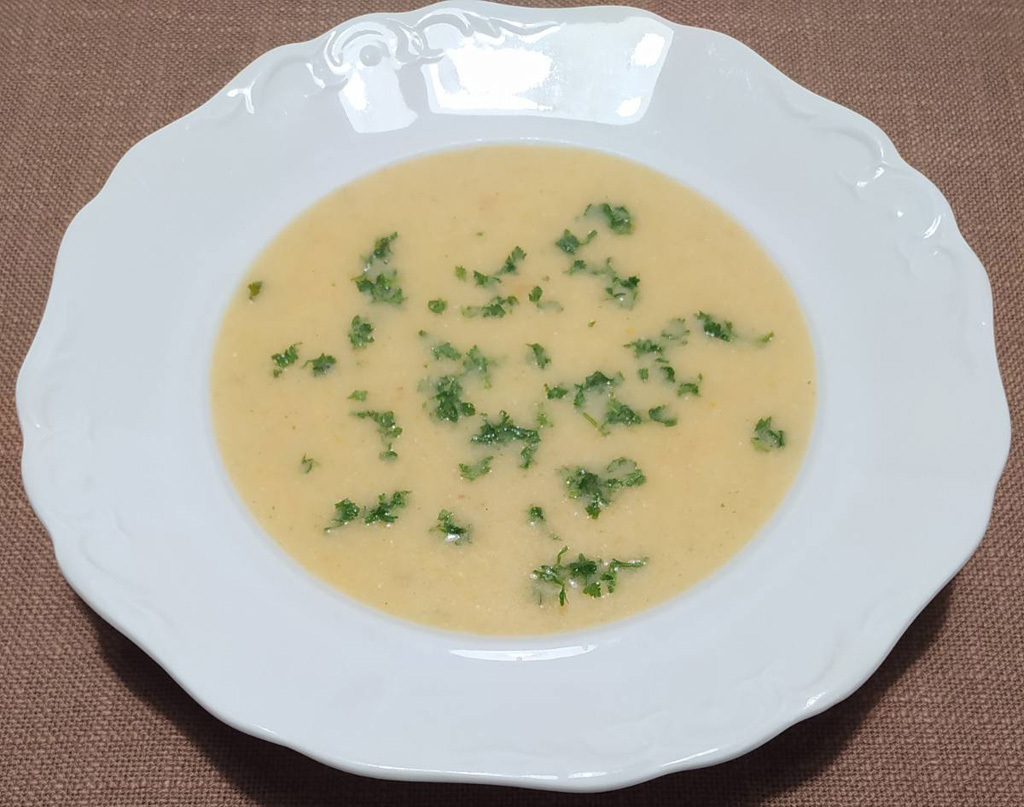 Az összes felaprított hozzávalót (a tejszínen kívül) 2 literes fazékba tesszük, ráöntjük az olajat ízlés szerint megsózzuk, felöntjük 1,8 l hideg vízzel, és takaréklángon addig főzzük, amíg nem puhul meg. Félrevesszük a tűzhelyről, botmixerrel pépesítjük, belekeverjük a főzőtejszínt, a tetejére hintjük a lestyánlevelet, és azonnal melegen fogyasztjuk.