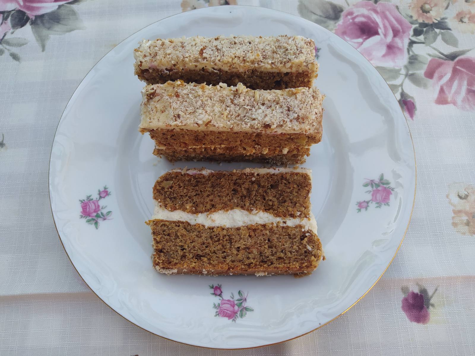 A tojássárgákat habosra keverjük a cukorral, fűszerekkel és a pálinkával, hozzákeverjük a sárgarépát, az olajat, a mandulát és diót, sót, majd a sütőporral elkevert lisztet és zsemlemorzsát is. Óvatosan belekeverjük a kemény habbá vert tojásfehérjét, és egy 20x30 centiméteres sütőpapírral kibélelt tepsibe öntjük, és 190 fokos előmelegített sütőben 45-50 perc alatt kisütjük. Rácson teljesen kihűtjük, és vízszintesen egyszer félbe vágjuk. A szoba hőmérsékletű vajat, tejszínt és cukrot habosra mixeljük, majd hozzákeverjük a mascarponet és a citromlevet. Ezzel a krémmel megtöltjük a tortát, és megkenjük vele a tetejét és az oldalát. Fél napig állni hagyjuk. Szeletelés előtt a tetejét meghintjük darált mandulával.