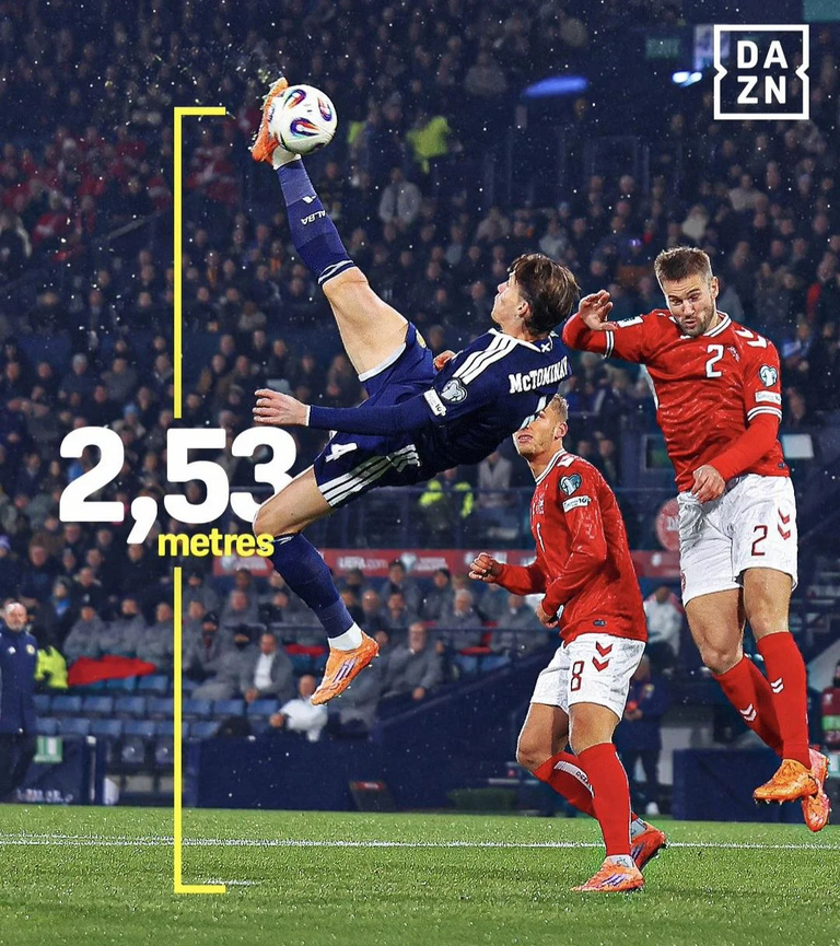 Megdőlt az ollózós gól világrekordja - A skótok egyik hőse, Scott McTominay egy óriásit ugorva talált a dán kapuba és ezzel Skócia kijutott a 2026-os világbajnokságra. A DAZN statisztikája szerint a középpályás új világcsúcsot döntött. McTominay 253 centi magasan rúgta meg a labdát, ollózós gólnál ez új csúcs, megelőzte többek között Cristiano Ronaldót és Paul Onuachut is. (reddit.com)