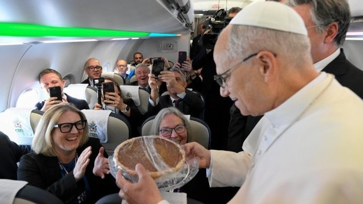 XIV. Leó pápa csütörtökön délelőtt megérkezett Törökországba, ez az első külföldi útja a katolikus egyház vezetőjeként. Az Ankarába tartó pápai repülőgép fedélzetén a pápa több mint 80 újságíróval együtt utazott, akik számos ajándékot adtak át neki. Kapott baseballütőt, missziós időszakából készült képeket, papucsot, zoknit, továbbá egy sütőtökös pitét is (a képen), hálaadás napja alkalmából. ((@Vatican Media))
